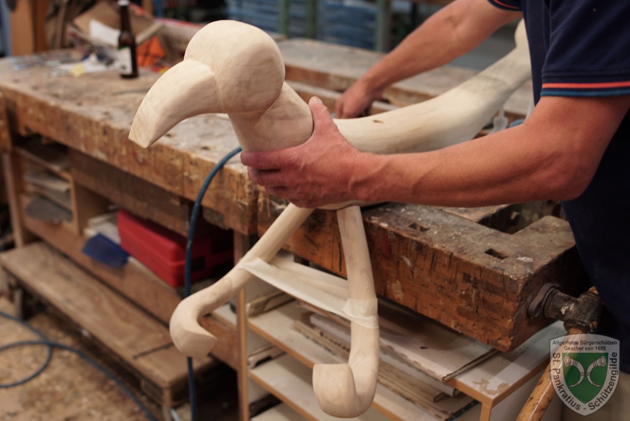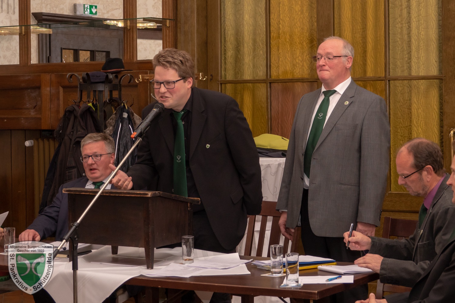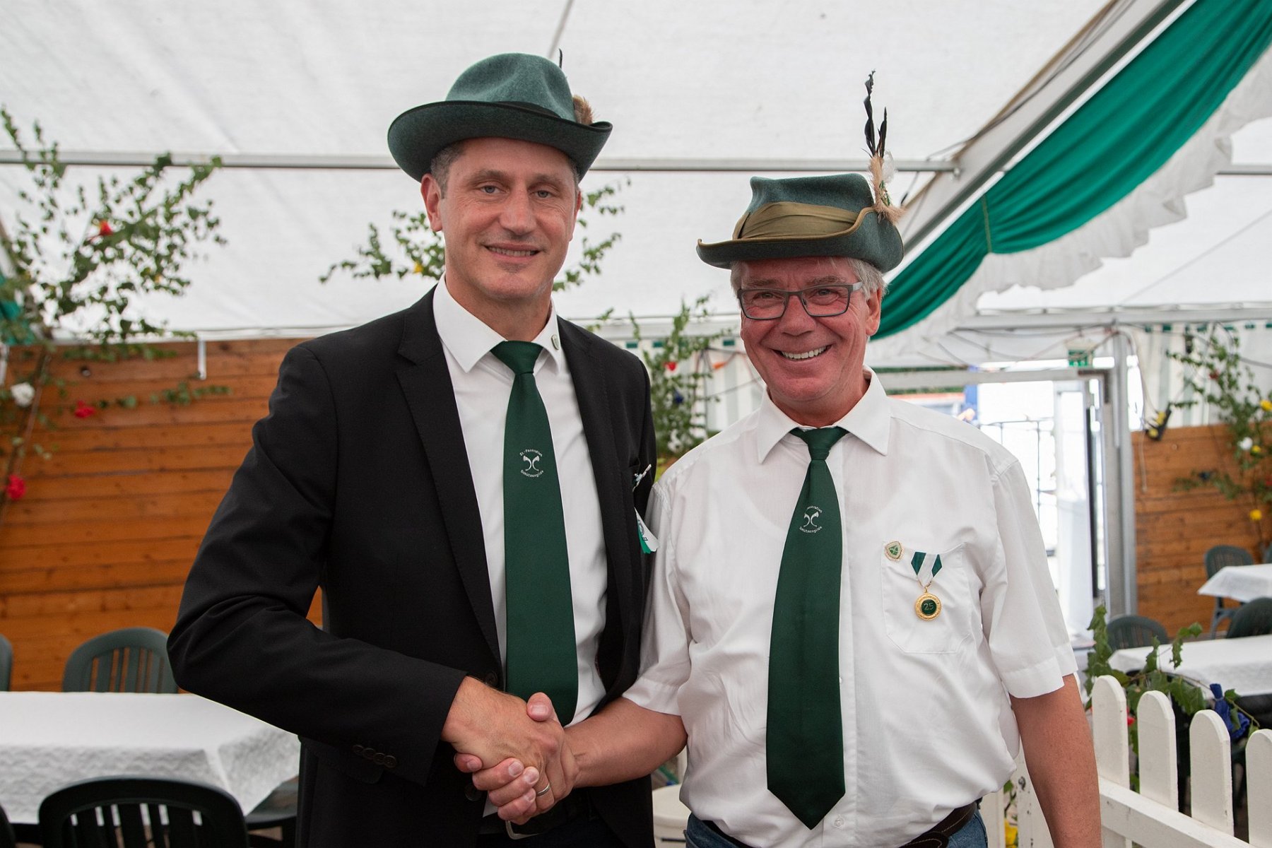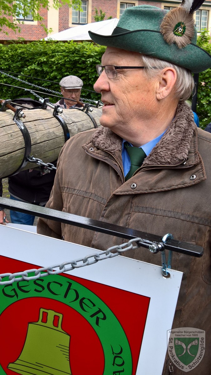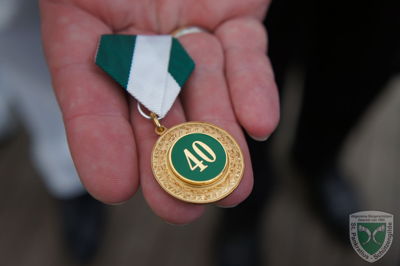Als er dann beim anschließenden Auskleiden seinen Hut mit Federbuch, Frack und den Säbel abgelegt hatte, wurde Ihm die Grundausstattung für Schützen – bestehend aus Krawatte, Holzgewehr und Offizier a.D. Ehrennadel überreicht. Wichtig war für Oberst Thomas Weghake dabei zu betonen, das Scheese nun zwar nicht mehr als Aktiver in der Gilde tätig ist, aber bei allen Aktionen als Ehrenoffizier und Gast gern gesehen ist.