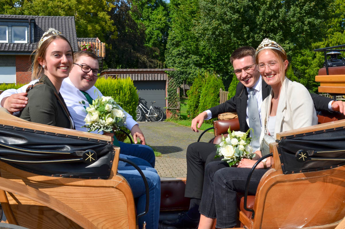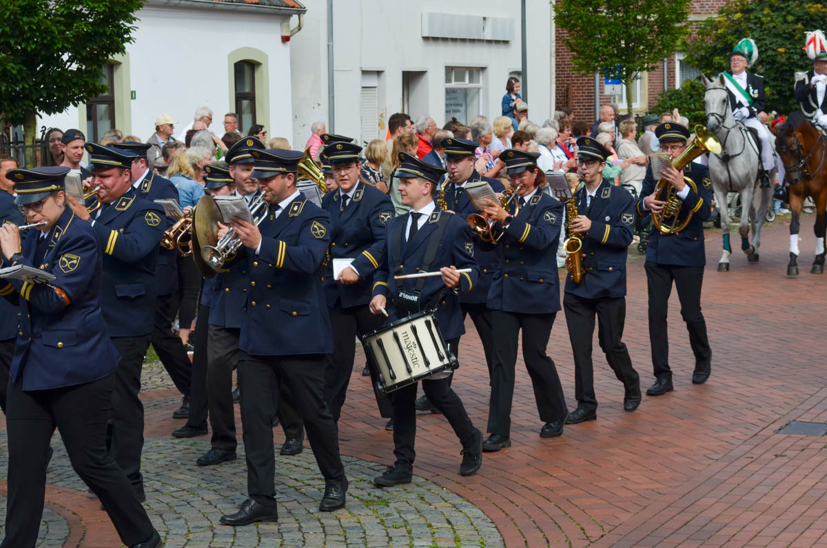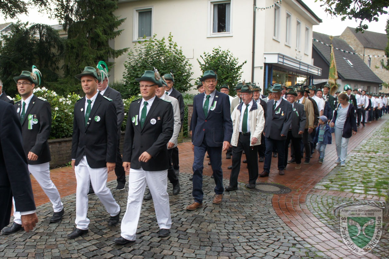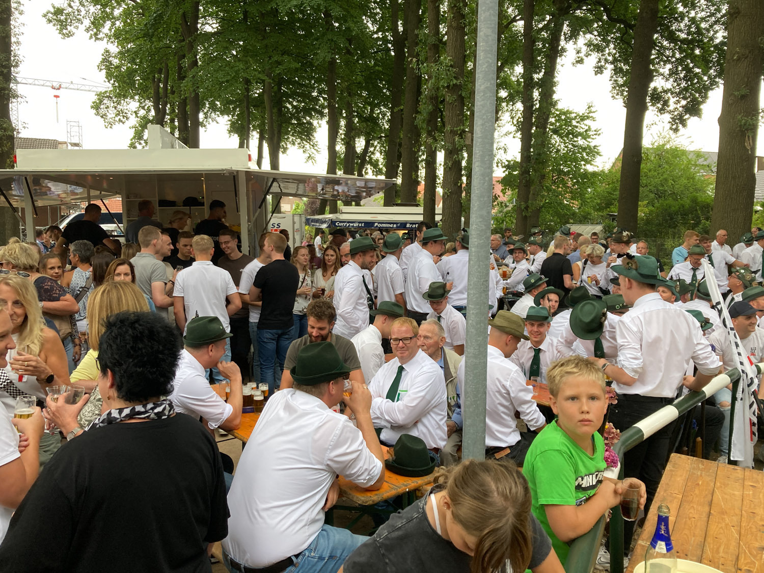 Gescher. (SK) Seit Pfingstsonntag ziert der Maibaum wieder Geschers „Gute Stube“. Unter großer Beteiligung wurde der knapp zwölf Meter lange Baum per Muskelkraft aufgestellt. Unter der Federführung der St. Pankratius-Schützengilde galt es, den Maibaum zu richten. Dazu trafen sich nicht nur die Schützen der Gilde, sondern auch Vertreter weitere Vereine auf dem Rathausplatz. „Angetreten zur Schilderentgegennahme!“, hieß es von Seiten des Oberst Thomas Weghake, der das Kommando über die gesamte Veranstaltung innehatte. „Leider müssen wir in diesem Jahr auf die Live-Musik verzichten“, bedauerte Präsident Peter Schmitz, konnte doch der Spielmannszug der Freiwilligen Feuerwehr nicht genügend Musiker stellen und ein Ersatz sei so schnell nicht gefunden worden. So ging es zu den Klängen einer „Hochleistungsmusikanlage“ in Marschformation vom Rathaus in die City. Dabei führten die Vereinsabordnungen die Schilder mit.