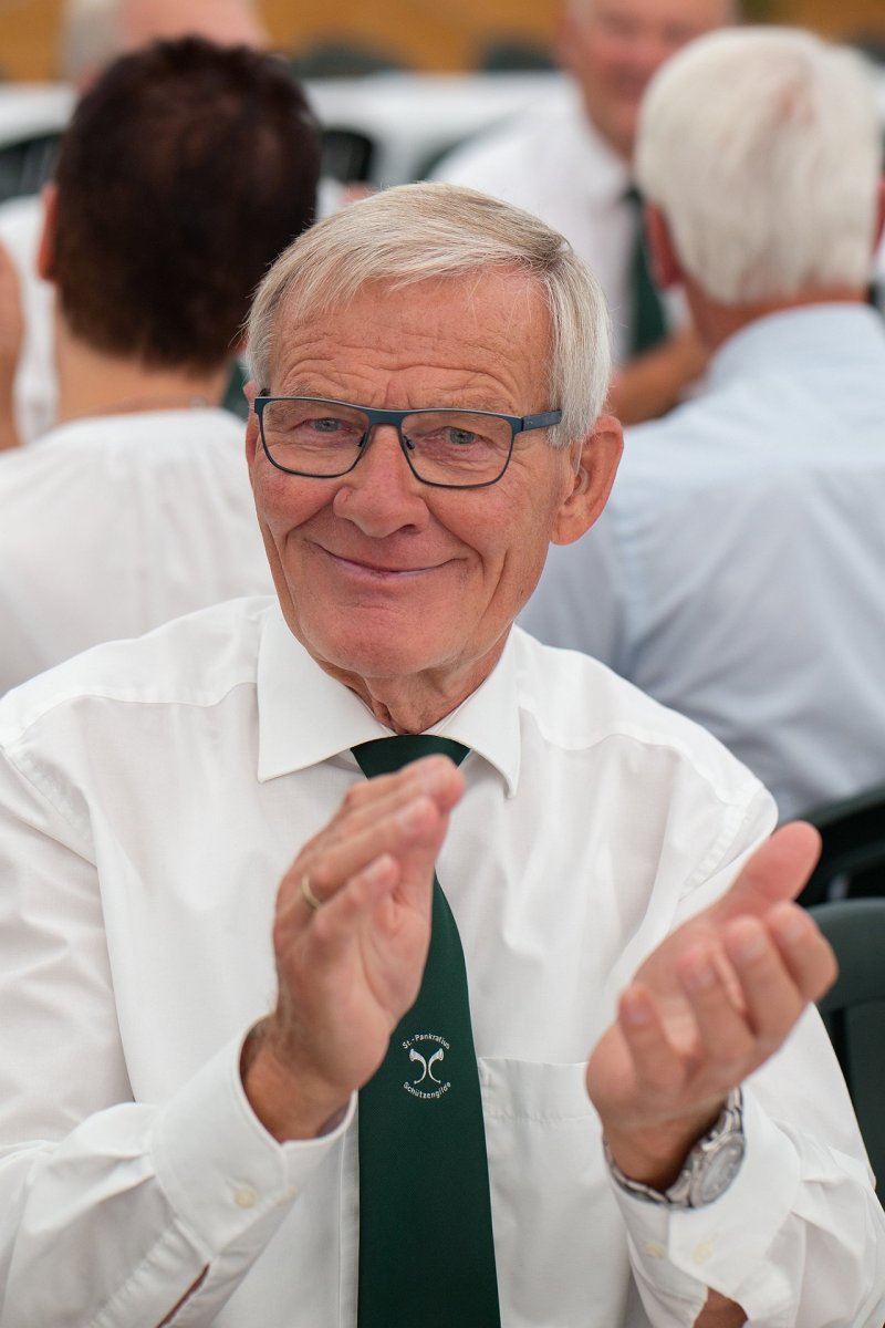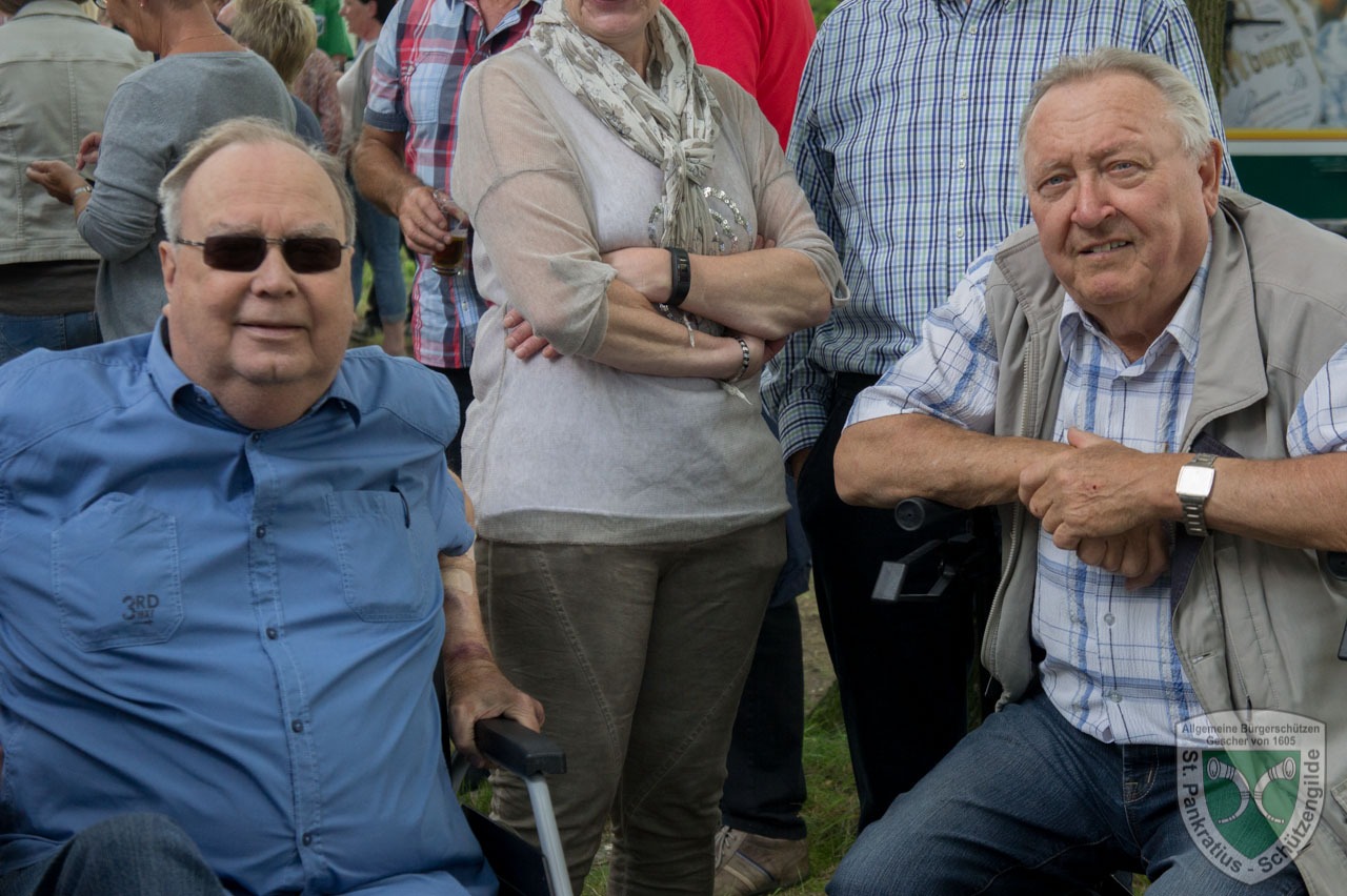 Die Gemeinschaft zähle als zentraler Punkt in der Gesellschaft, führte Schmitz aus. Zentraler Punkt seien in der Glockenstadt die Nachbarschaften und so sollte das Schild der vereinten Nachbarschaften auch den zentralen Punkt des Maibaums bilden. Oberpräsident Manni Blesenkemper hatte die Ehre, dieses in die Spitze des Baumes zu hängen. Ferner zieren die Schilder von KAB, Schützen Grüne Wiese, Zucht-, Reit- und Fahrverein, Kfd, Imkerverein, den Sportvereinen SV und TV, Angelsportverein, Hegering, Marienkameradschaft, Karnevalisten, Bürgerstiftung, Freiwilliger Feuerwehr, DRK, Spielmannszug, Landfrauen und Landjugend, Landwirtschaftlichem Ortsverein, Pfadfinder, Kolping, MGV-Gaschari und der Stadt Gescher den Baum. „Freiwillige vor“, rief Weghake in die Menge sollte doch der Baum per Muskelkraft in die Höhe gehievt werden. Der Ruf blieb nicht unerhört. „Jetzt wird in die Hände gespuckt“, sagte er. Tatkräftige Männer brachten den Tonnenschweren Baum Zentimeter für Zentimeter in die Vertikale. Gespannt verfolgten zahlreiche Besucher das nicht ungefährliche Geschehen. Männer der Freiwilligen Feuerwehr unterstützen das Geschehen und sicherten während der Aktion mit einer Seilwinde den Baum.
