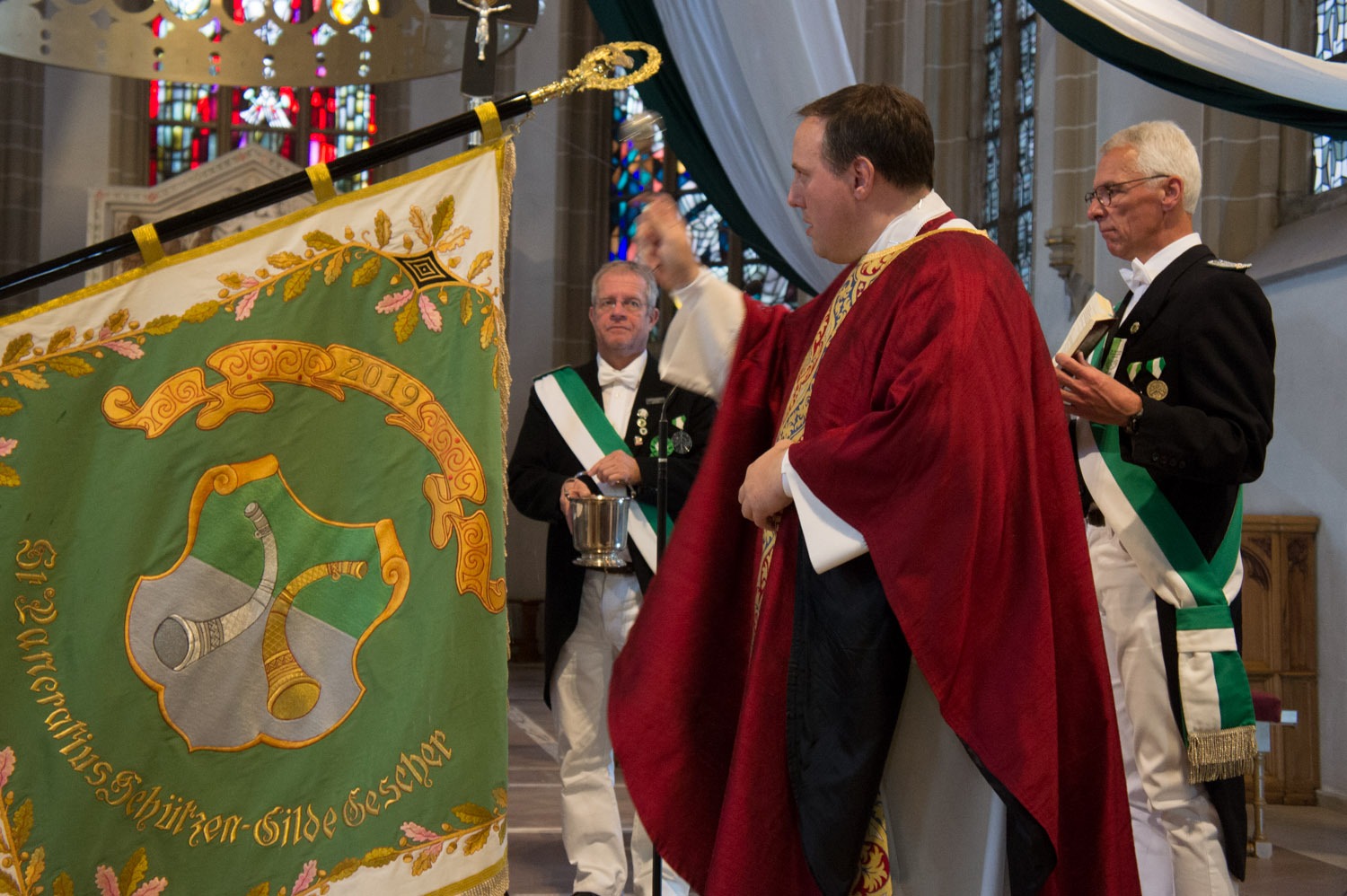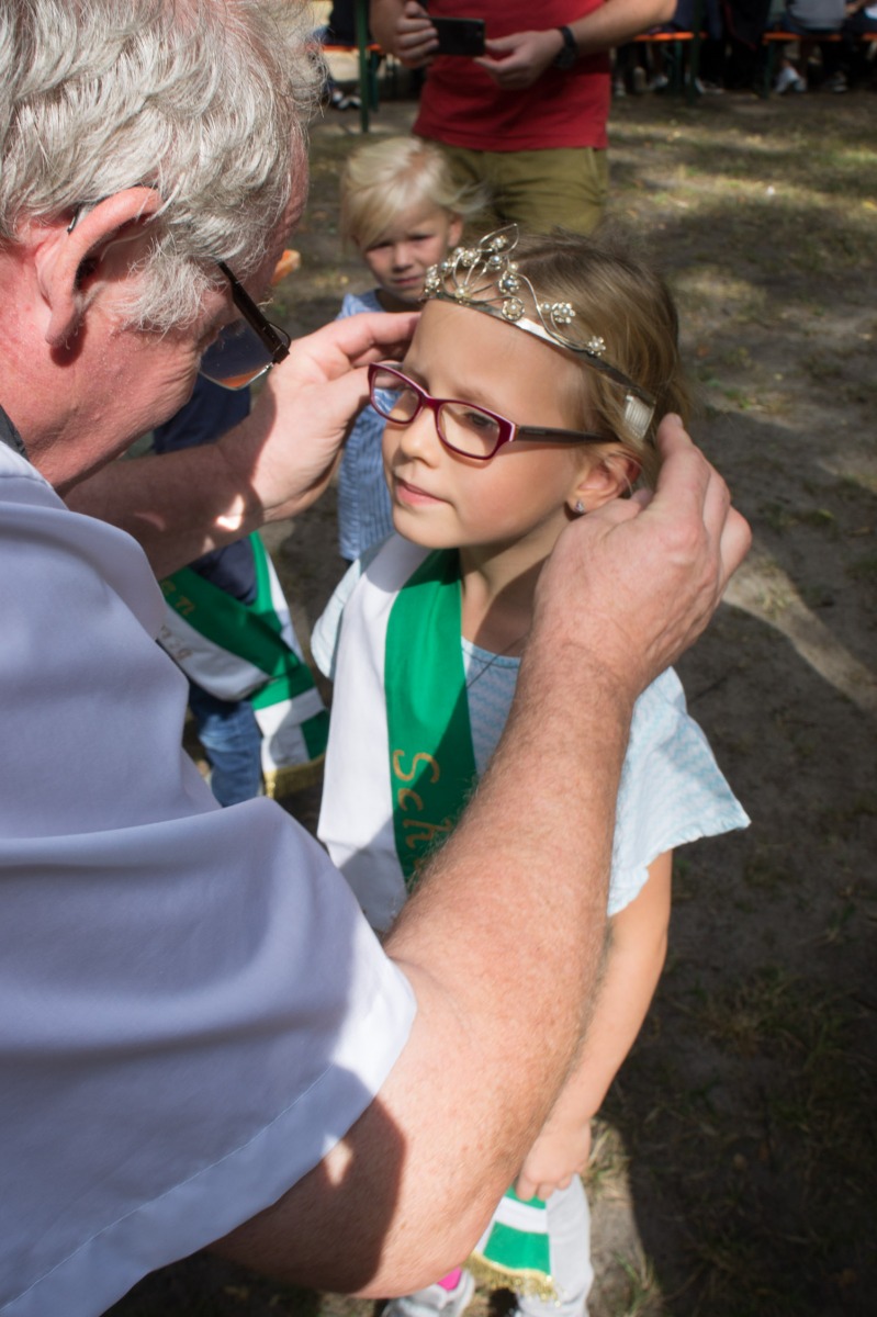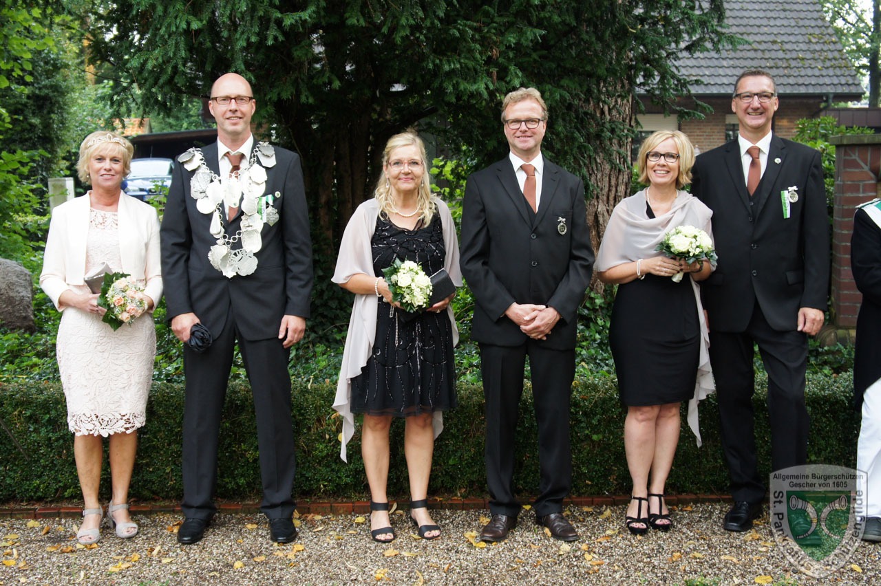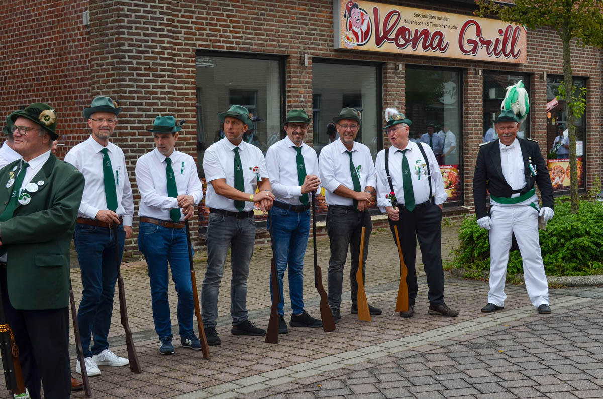 So verwundert es auch nicht, dass etliche ehemalige Königinnen der Gilde es sich nicht nehmen ließen und extra für den Zwischenstop der Prozession zur Schützenstation erschienen. Ebenso begleiteten die Fahnenoffiziere mit der Vereinsfahne die Prozession um einen feierlichen Rahmen zu bilden.